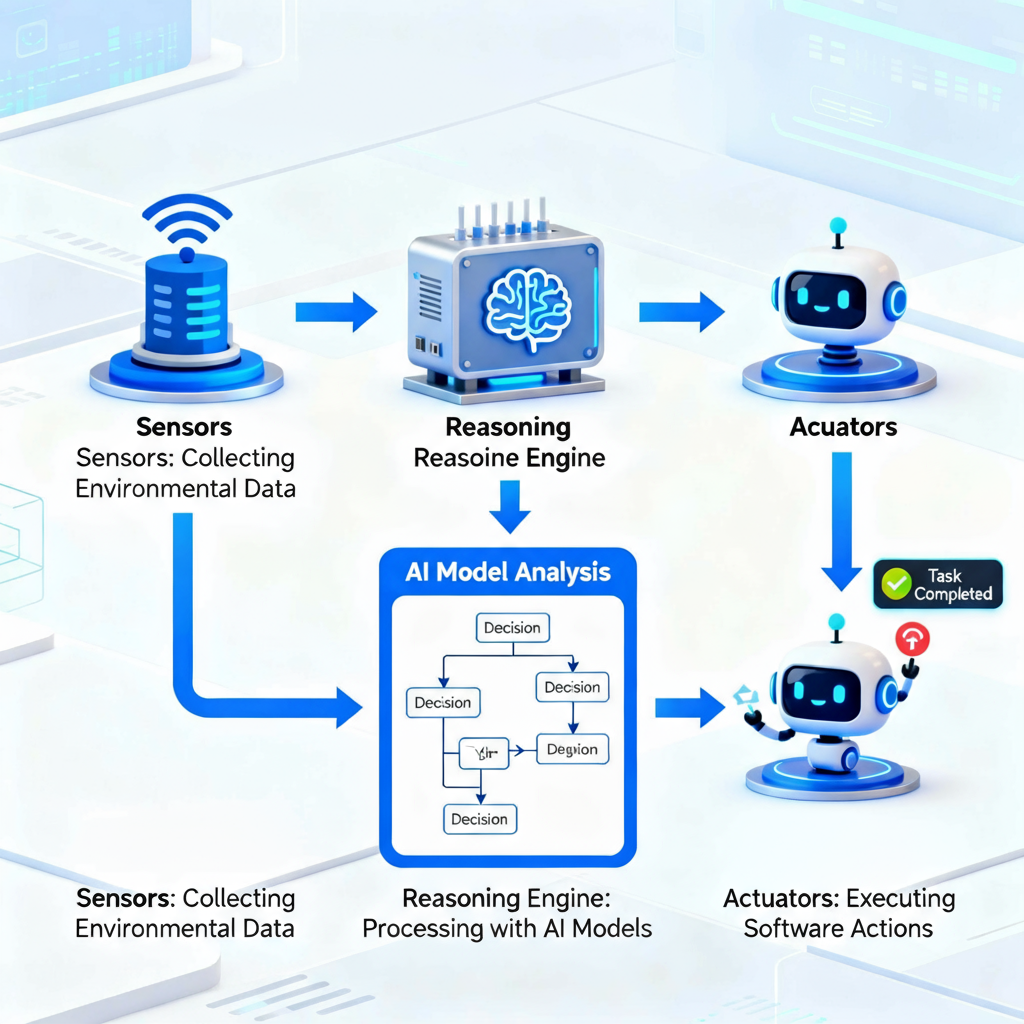 AI agents operate using three core components- sensors, a reasoning engine, and actuators. Sensors act as the agent’s input system, collecting structured and unstructured data from various sources like APIs, documents, or physical devices. This data provides the agent with context about its environment and tasks.