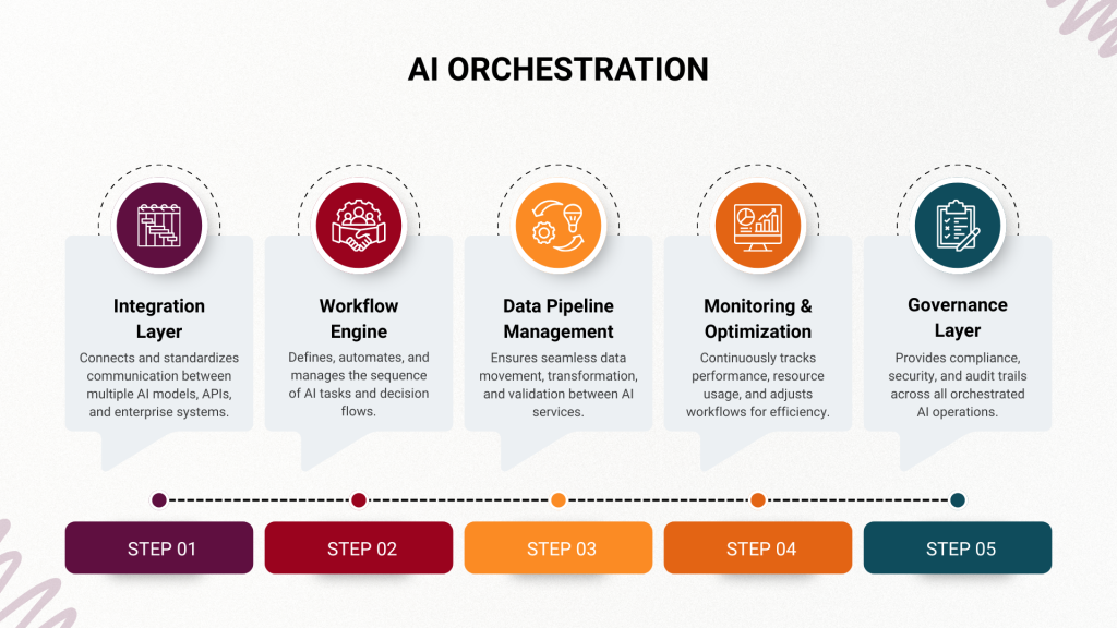 - Governance Layer – Provides compliance, audit trails, and security across orchestrated systems.